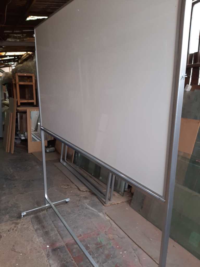 Pizarra blanca acrílica para plumón una o dos caras con atril metálico móvil de 1.85 m, color metálico o mate pintado en horno, 4 ruedas (2 traseras con freno), MDF espesor de 12 mm, marco de aluminio. Incluye bandeja de borrador.
