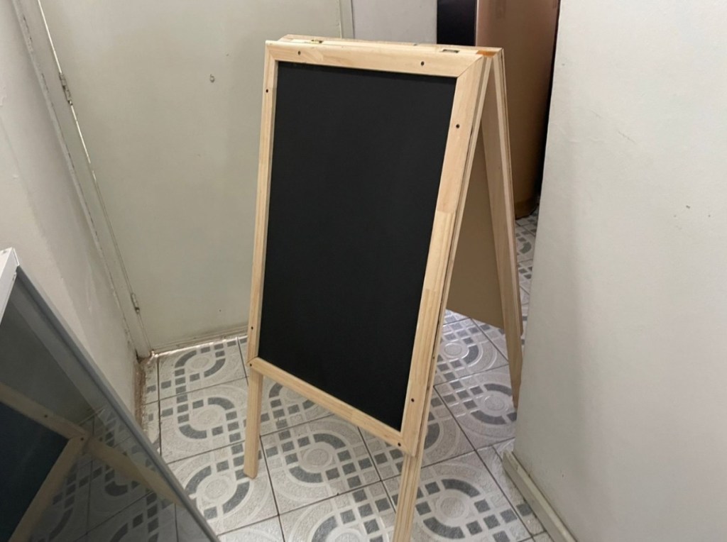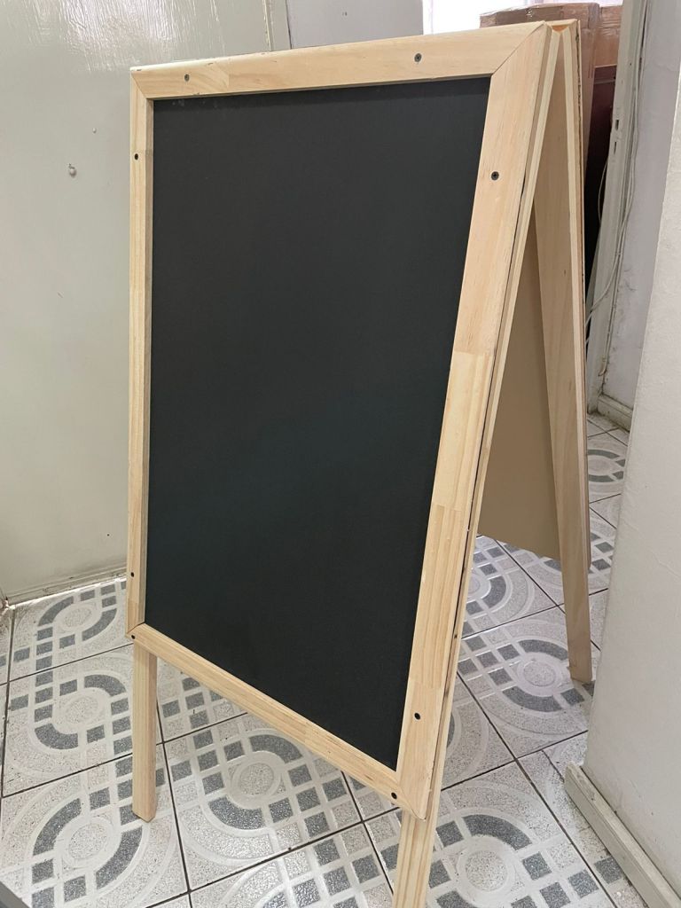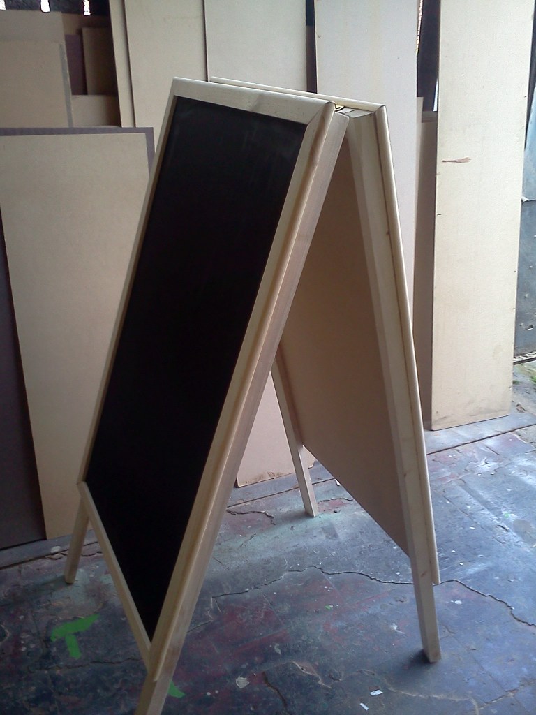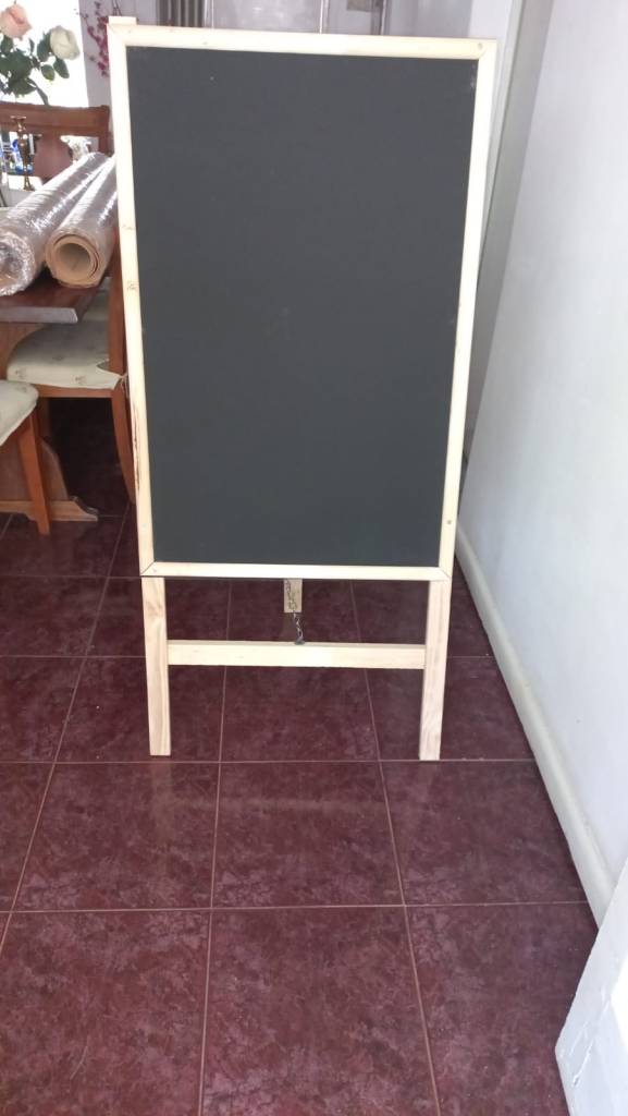 Pizarras de tiza simples de una cara, o dobles, hechas con atril de madera. Marco de 1×2 pulgadas de espesor y pintura negra para tiza. Medida de pizarra 90×60, con atril 120×60 cm.